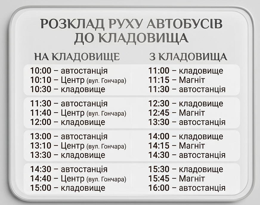 Звертаємо увагу, що з центру до кладовища автобус їхатиме через вул. Ст.Бандери, а повертатиметься з кладовища у центр через вул. Незалежності.