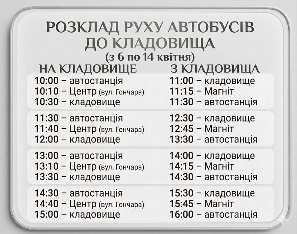 Звертаємо увагу, що з центру до кладовища автобус їхатиме через вул. Ст.Бандери, а повертатиметься з кладовища у центр через вул. Незалежності.