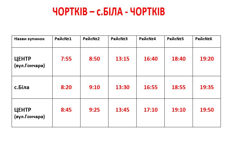 КП «Чортківський міський транспорт», беручи до уваги побажання пасажирів, вносить зміни до графіка руху автобуса, що курсує за маршрутом с. Біла – Чортків.