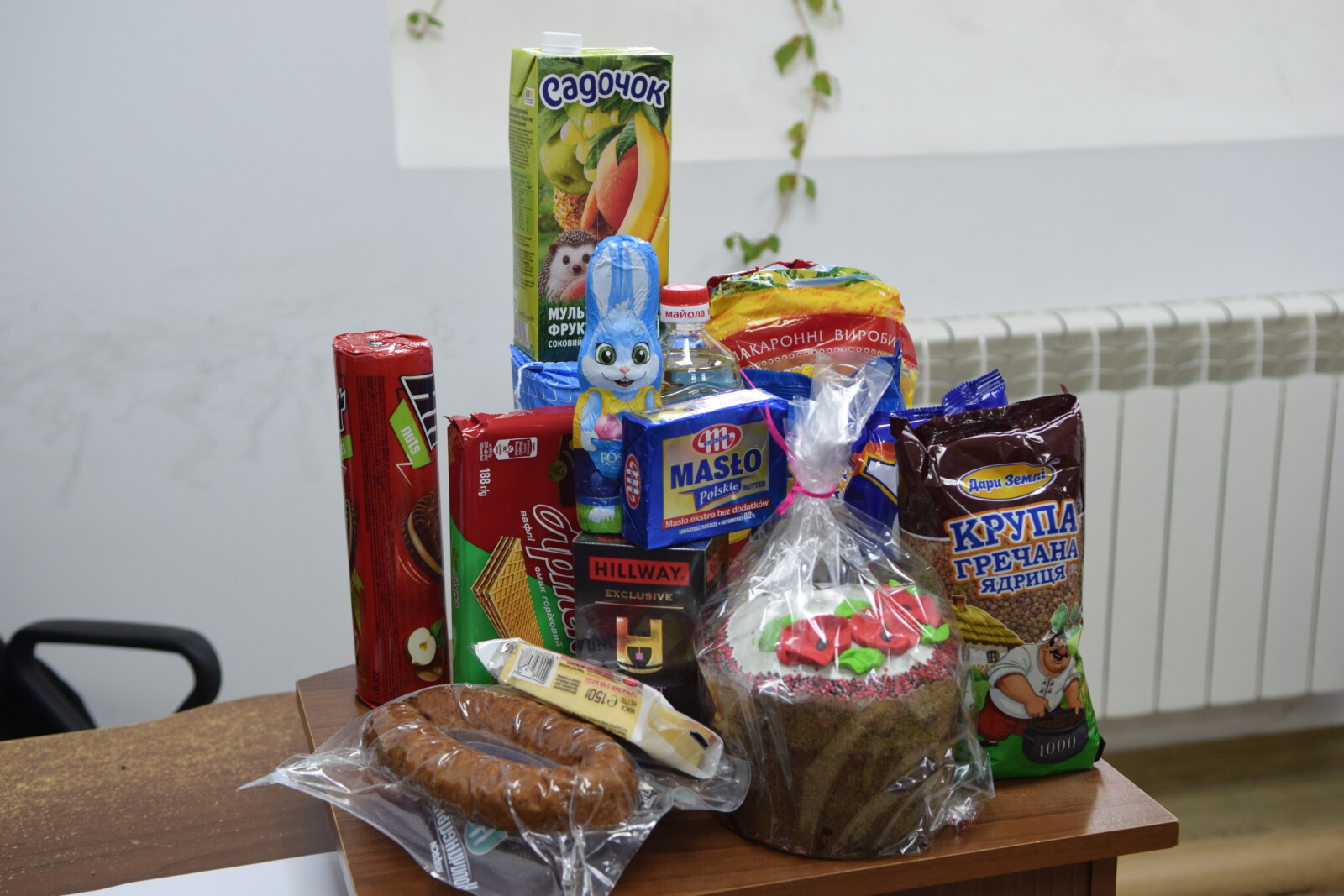 У кожному пакунку – крупи, макарони, мука, олія, масло, ковбаса, сир, чай, бабка, шоколад, печиво, вафлі та сік.