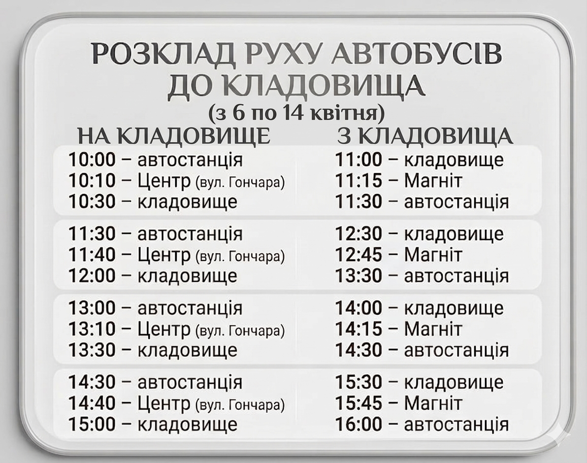 Нагадуємо, що у Чортківській громаді курсує автобус КП «Чортків міськтранс» за маршрутом №4 «Чортків – Росохач», яким можна дістатися до кладовища на вул. Ягільницька 4 рази у будні та 3 рази у суботу. Графік руху можна подивитись за посиланням: https://www.chortkivmr.gov.ua/.../rozklady-ruhu-po.../