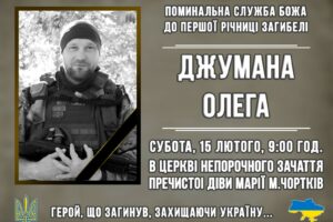 Поминальна служба Божа відбудеться у суботу, 15 лютого, о 9 год. у церкві Непорочного Зачаття Пречистоі Діви Марії м. Чортків. Джуман Олег Сергійович народився 19 квітня 1984 року в м. Сокаль Львівської області. Навчався у Сокальській ЗОШ №3, поглиблено вивчаючи англійську мову. Закінчив Національний університет «Львівська політехніка». Був майстром спорту з плавання. Проходив строкову […]