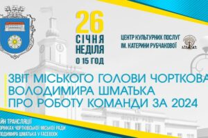 Запрошуємо у неділю, 26 січня, о 15 год. у Центр культурних послуг ім. К. Рубчакової на публічний звіт міського голови Володимира Шматька про роботу Чортківської міської ради у 2024 році. Також анонсуємо, що буде онлайн трансляція звіту на сторінках Чортківської міської ради та Володимира Шматька у Facebook.