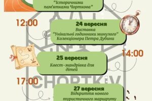 З 22 по 28 вересня у Чорткові відбудеться «Тиждень туризму». Програма заходів: 22 вересня, 15:00 ЗАБІГ «Історичними пам’ятками Чорткова» Старт: Центр культурних послуг ім. Катерини Рубчакової Фініш: Парк Івана Франка 24 вересня, 12:00 ВИСТАВКА «Унікальні годинники минулого» Колекціонера Петра Дубини Місце: вежа Чортківської міської ради Виставка діятиме впродовж тижня 25 вересня, 14:00 […]
