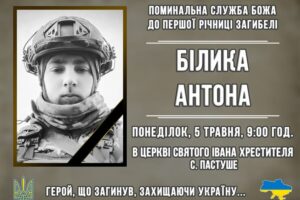 Поминальна служба Божа відбудеться у понеділок, 5 травня, о 9 год. у церкві Святого Івана Хрестителя с. Пастуше. Після поминальної служби на кладовищі села відбудеться освячення пам’ятника Герою. Біографія: Білик Антон Володимирович народився 24 березня 1999 року в с. Пастуше. Навчався у Заводській ЗОШ. У 2020 році закінчив Західноукраїнський національний університет. Працював у кафе […]
